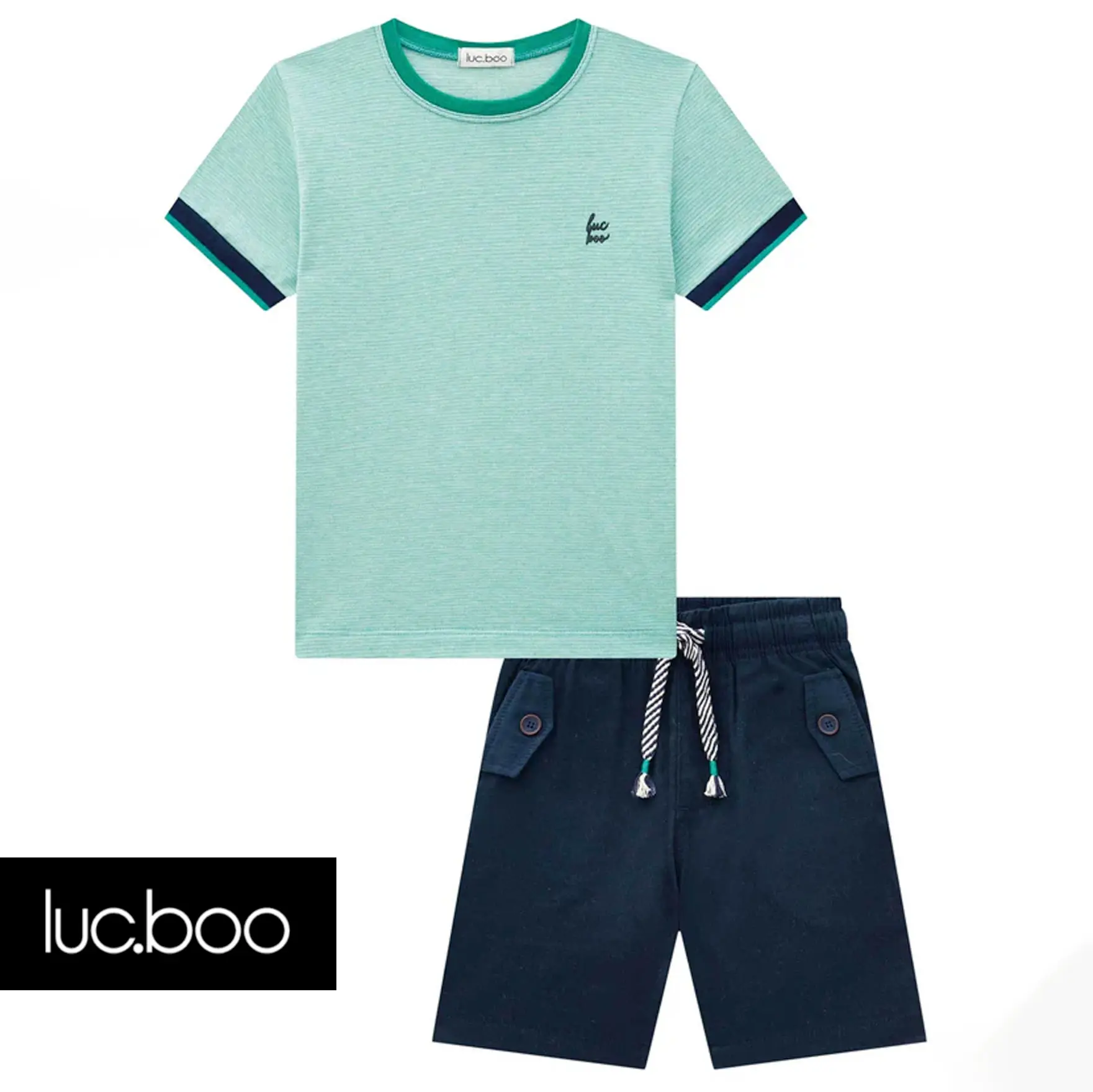 Conjunto masc. Três e já camisa malha e bermuda linho