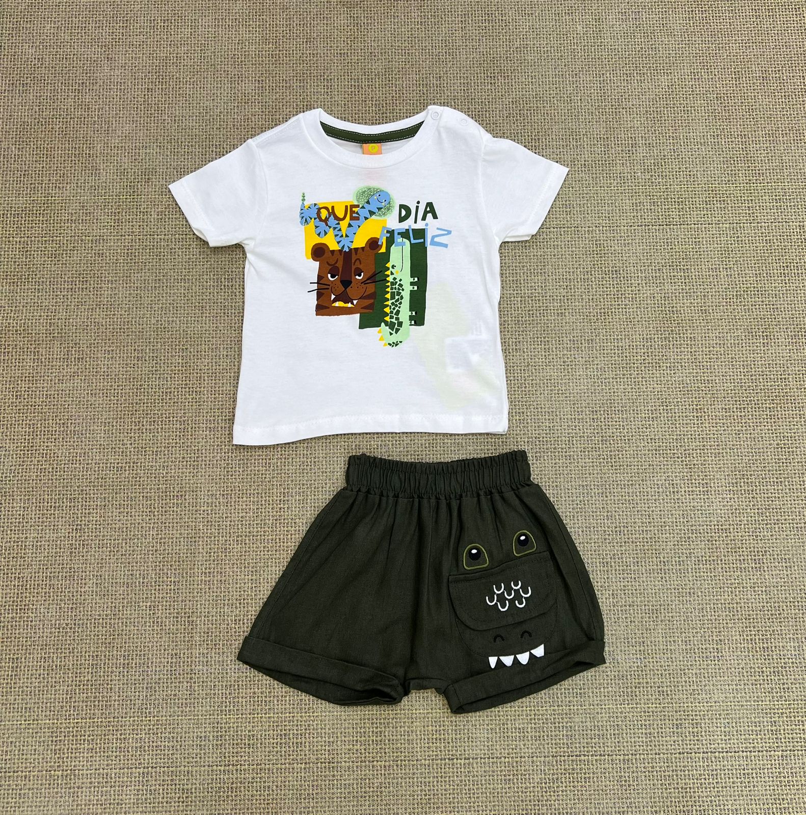 Conjunto masc. Três e já camisa malha e bermuda linho